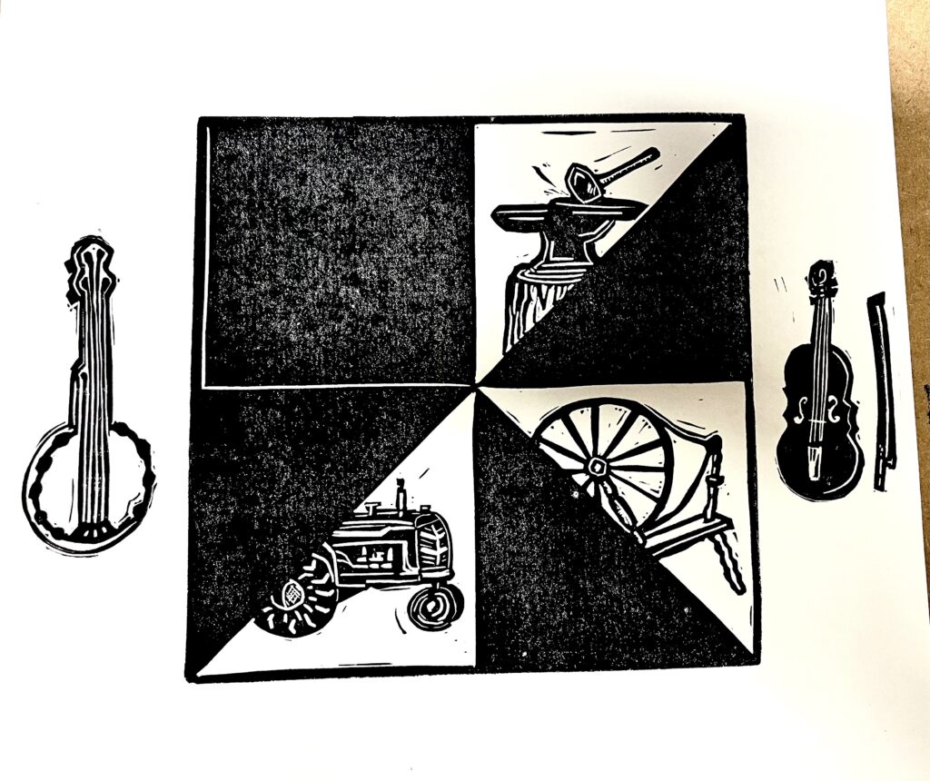 You will learn a little about the tools and process of making linocut blocks and have the option of making your own print on a poster or tote bag.